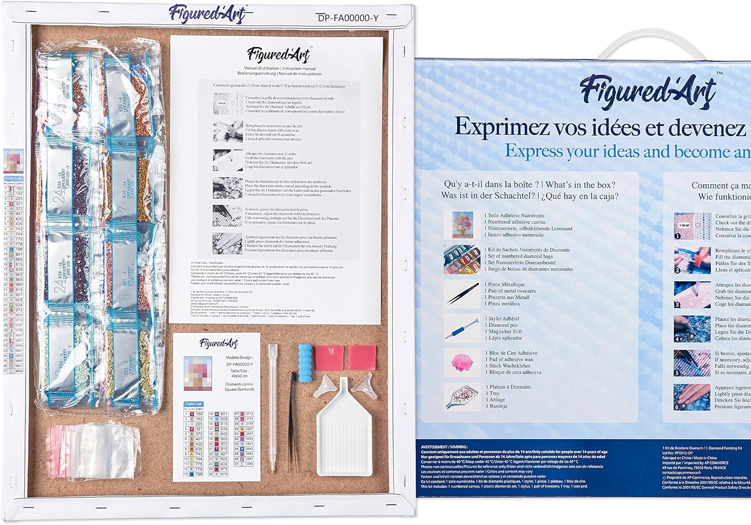 Color coded diamonds (safe and eco-friendly rhinestones). We add 30% more diamonds than necessary to make sure you really have enough to complete your masterpiece