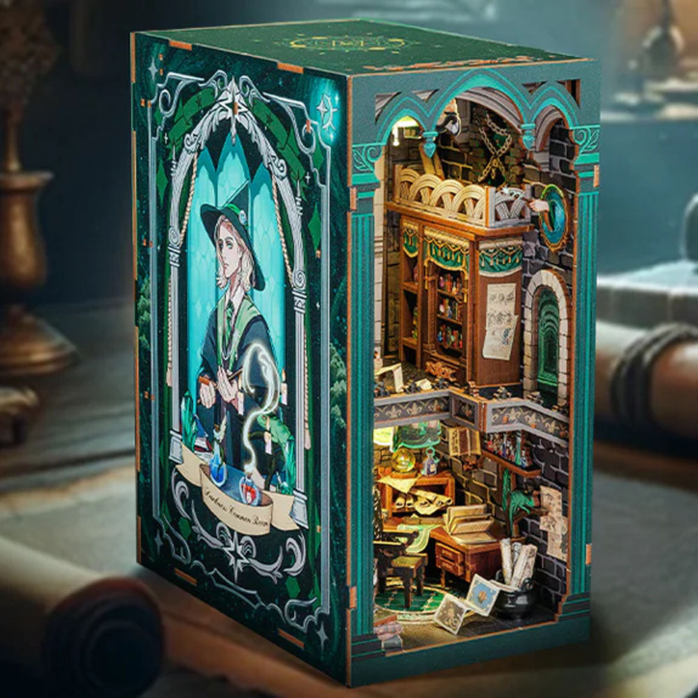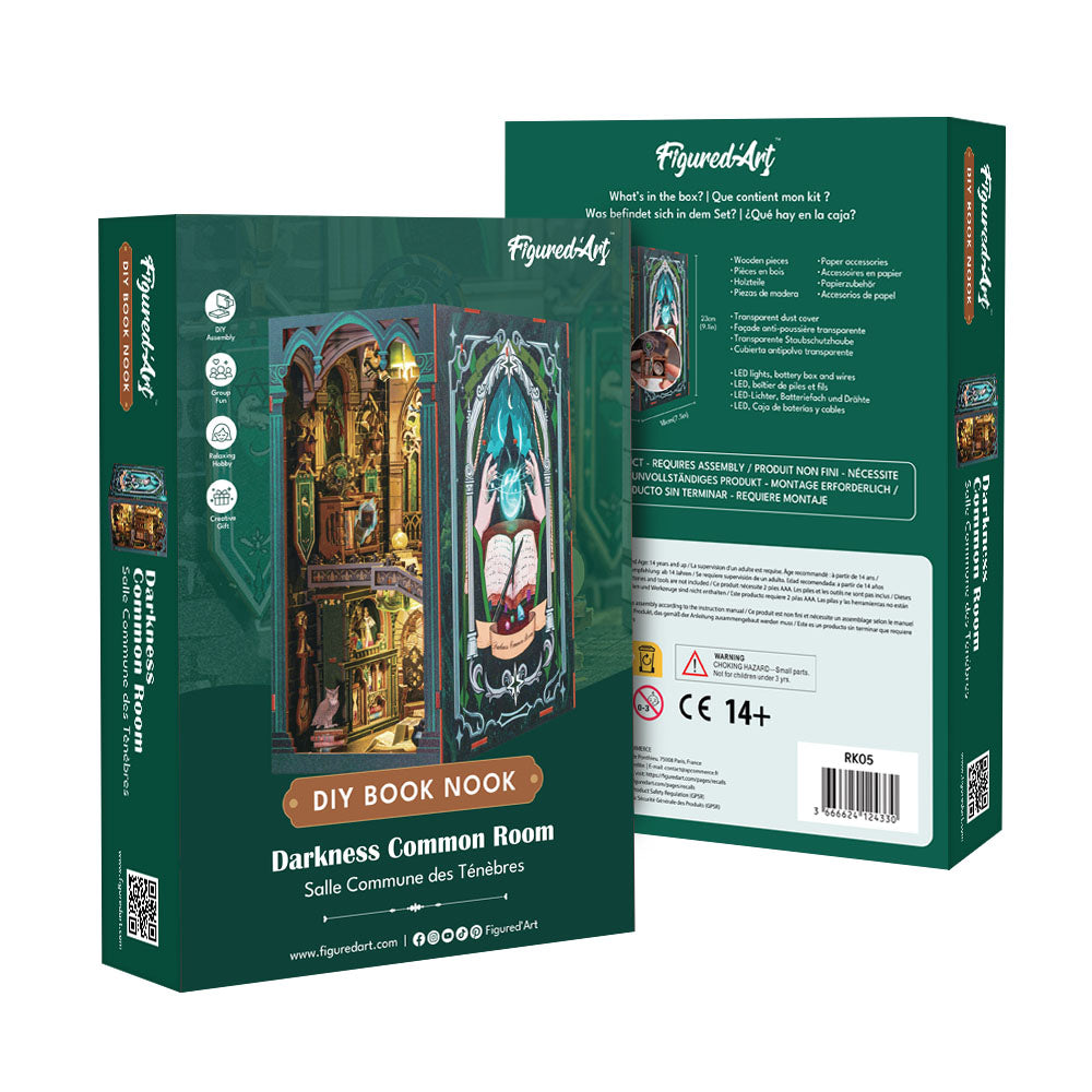 Bring the dark enchantment of the Darkness Common Room to your bookshelf, desk, or any flat surface with this captivating DIY Book Nook kit. Assemble, decorate, and light up your miniature world! Display it as a unique bookshelf insert or a standalone magical scene.