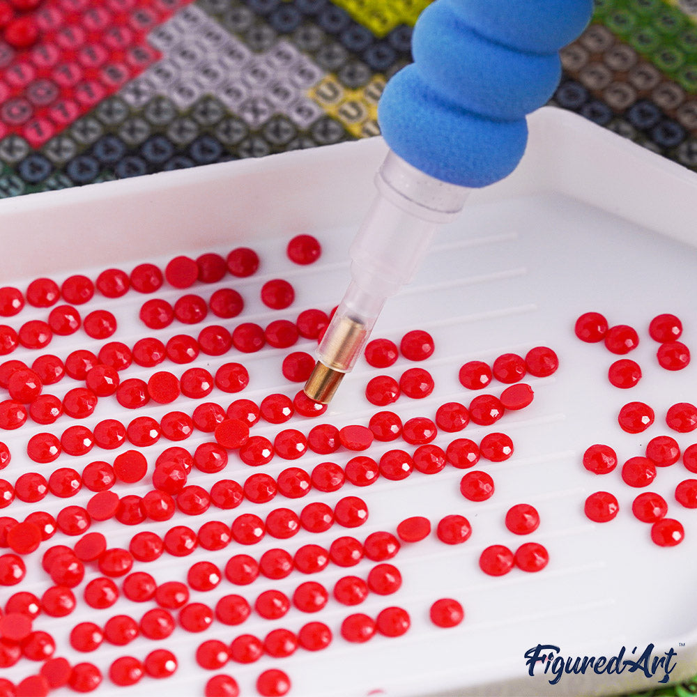 Colour coded diamonds (safe and eco-friendly rhinestones). We add 30% more diamonds than necessary to make sure you really have enough to complete your masterpiece